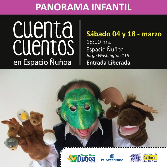 Este sábado 4 de marzo y el 18 de marzo, la Corporación Cultural de Ñuñoa invita a toda la familia al “Cuenta Cuentos” que se realizará a las 18:00 horas en el Espacio Ñuñoa (Jorge Washington 116).